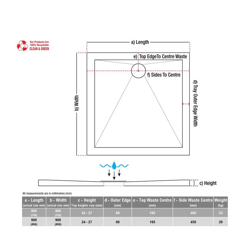 Opulent 28mm Anti-Slip Ultra-Slim 900mm Square Tray and Waste (OBC111476)