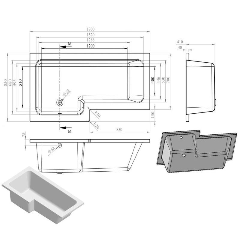 Opulent Carlisle L Shape Supercast 1700x850x560mm Shower Bath Pack - Left Hand - Brushed Brass (OBC111380)