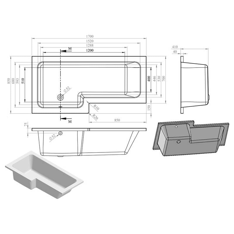Opulent Carlisle L Shape Supercast 1700x850x560mm Shower Bath Pack - Left Hand - Chrome (OBC105605)
