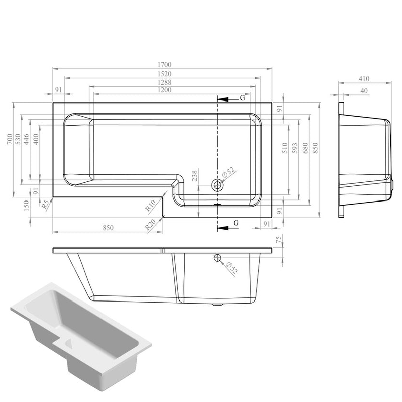 Opulent Carlisle L Shape Supercast 1700x850x560mm Shower Bath Pack - Right Hand - Brushed Brass (OBC111381)