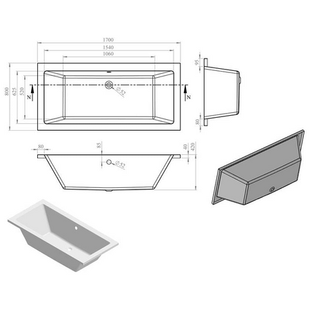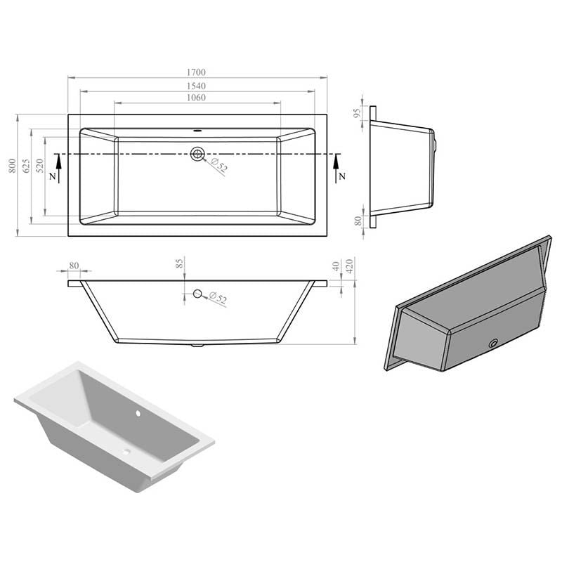 Opulent Carlisle Square Double End 1700x800x550mm Bath with Legs (OBC105653)