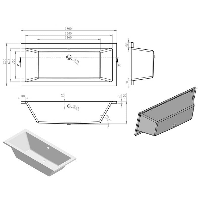 Opulent Carlisle Square Double End 1800x800x550mm Bath with Legs (OBC105654)