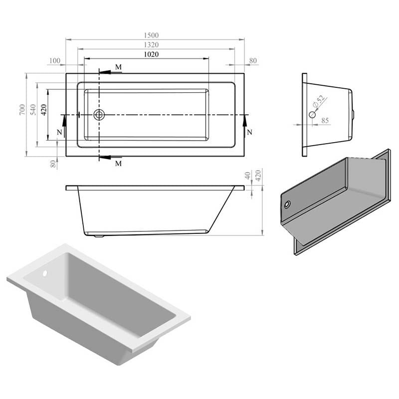 Opulent Carlisle Square Single End 1500x700x550mm Bath with Legs (OBC105619)