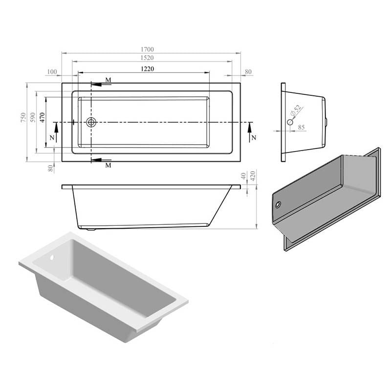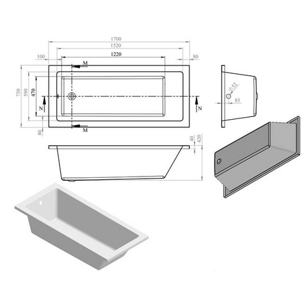 Opulent Carlisle Square Single End Supercast 1700x750x550mm Bath with Legs (OBC105626)
