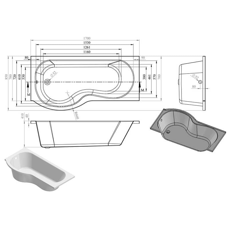 Opulent Easton P Shape Supercast 1700x850x560mm Shower Bath Pack - Left Hand (OBC105611)