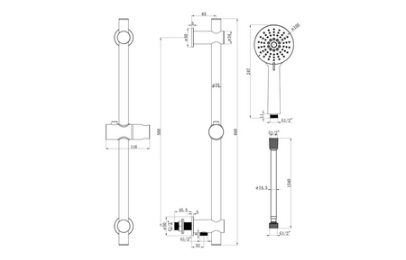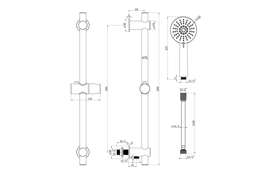 - Kit Includes: 3 Mode Handset, 1.5m Hose, Riser Rail With Brass Brackets & Wall Elbow