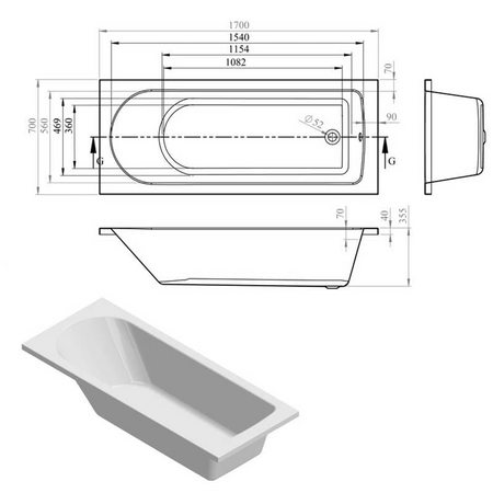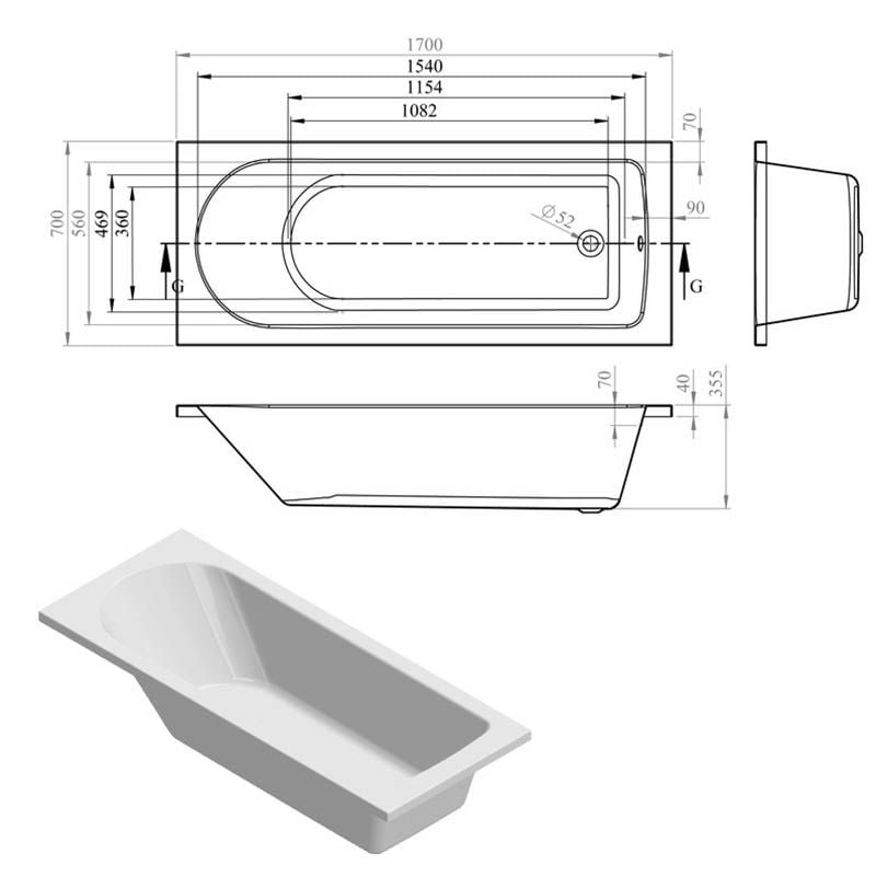 Opulent Trainor D Shape Single End 1700x700x550mm Two Tap Hole Bath with Legs (OBC105639)